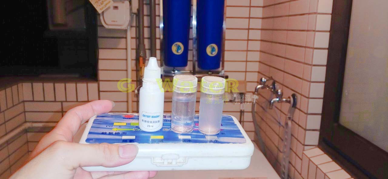 水質檢測: 左邊已過濾(軟水)、右邊未過濾(硬水)