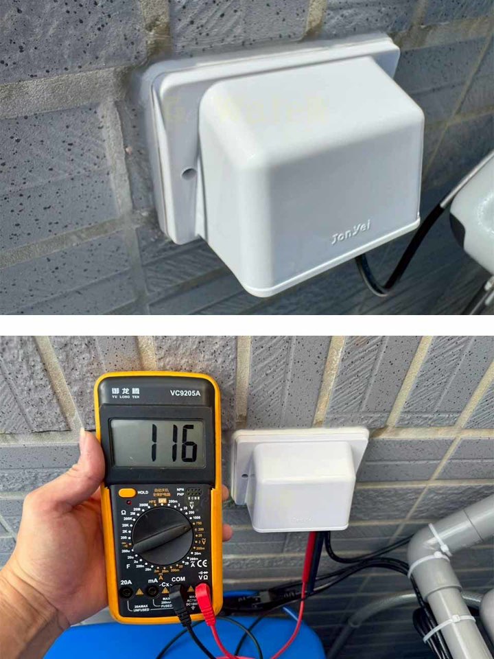 電源插座採用(防水戶外型),四邊再加強矽利康防止漏水漏電跟電壓確認