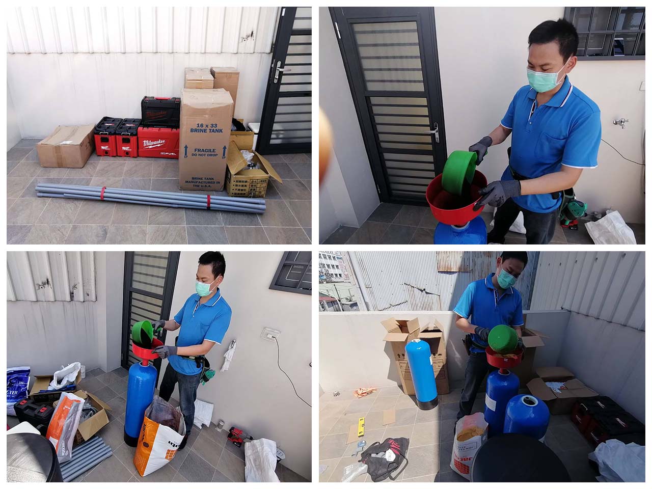設備材料排列濾材看得見不偷工減料(採用食品級認證級濾材),都是現場填充
