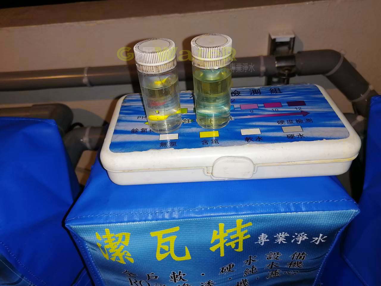 水質檢測: 左邊已過濾(無氯)、右邊未過濾(有氯)